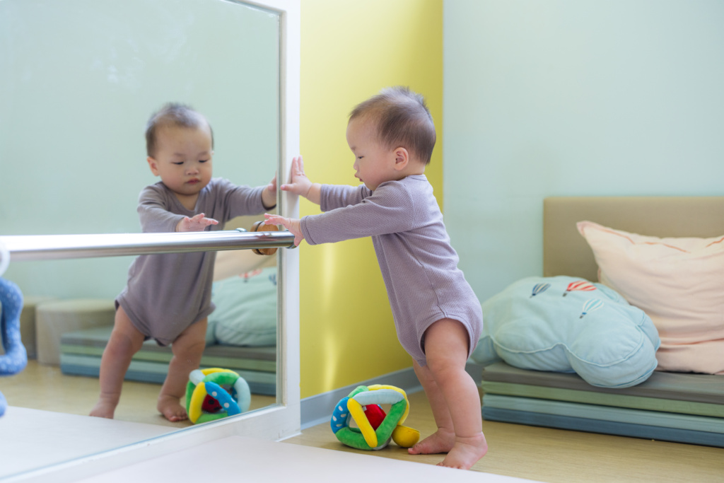 Posez un miroir non brisable à hauteur du bébé. Il découvrira son reflet, expérimentera le mouvement, développera sa conscience corporelle. Simple, gratuit, fascinant.