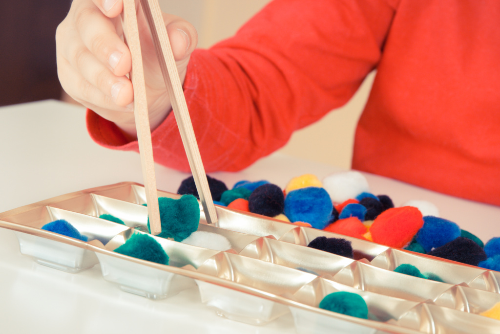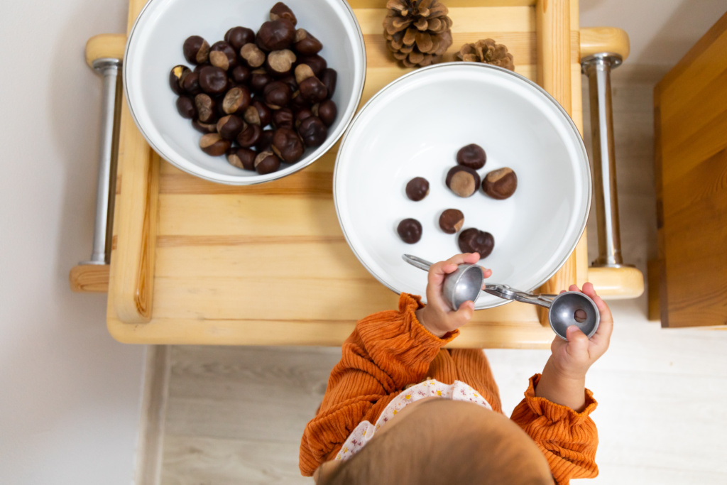 Proposez deux petits récipients et des lentilles, des pâtes ou du sable. L’enfant verse d’un contenant à l’autre. Cette activité, incontournable en classe Montessori, développe la coordination, la concentration et prépare à l’écriture.