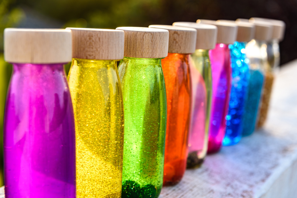 Remplissez une bouteille en plastique fermée avec de l’eau colorée, des paillettes ou du sable fin. Bébé peut la rouler, l’agiter, l’observer. Elle calme, intrigue et stimule la vision.